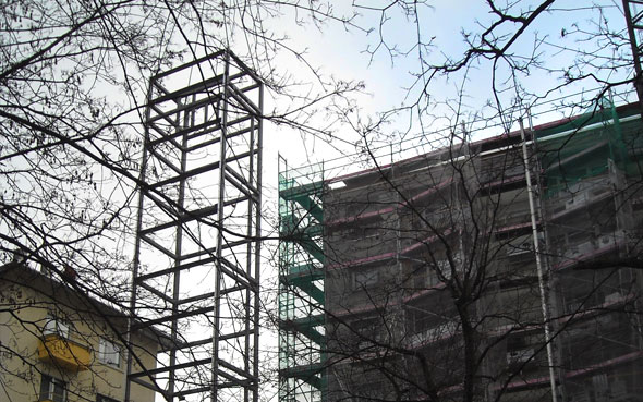 Nachträglich angebaute Aufzüge werden fast ausschließlich über Stahlrohr-Schachtgerüste realisiert.
