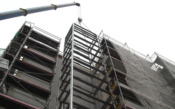 Durch das Vorstellen von Schachtgerüsten für Außenaufzüge lassen sich wirtschaftlich auch hohe Häuser mit Aufzugsanlagen nachrüsten. Eignen tut sich diese Anbauart aber auch für kleine Wohneinheiten, da die Schachtgerüste einfach auf eine Fundamentgrube gestellt und am Gebäude befestigt werden.