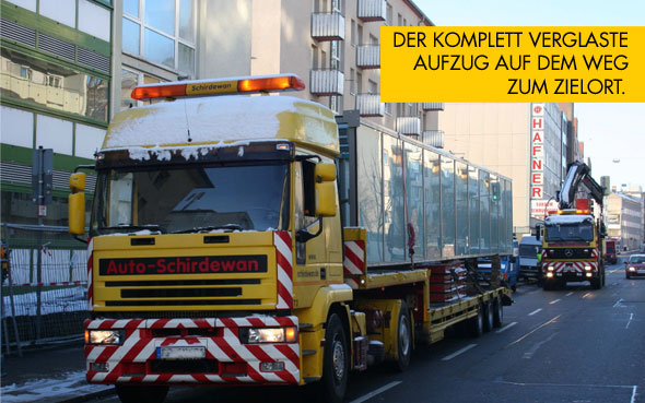 Aufzugsschacht kommt komplett verglast auf die Baustelle
