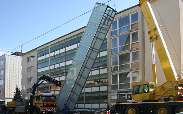 Wenn alle Voraussetzungen passen, bieten wir Ihnen gerne an, das Aufzugsschachtgerüst bereits fix und fertig verglast auf die Baustelle zu bringen. Die Montage vor Ort ist dann wesentlich schneller.