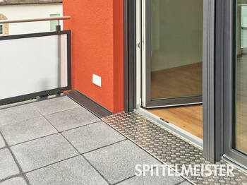 Saubere Übergänge, wie hier zum Aufzug und am Übertritt in den Wohnbereich erreicht man beispielsweise mit Riffelblechen. Im Bild: Unsere Spittelmeister® Balkon-Aufzug-Kombi – unsere Möglichkeit, Barrieren am Altbau zu verringern