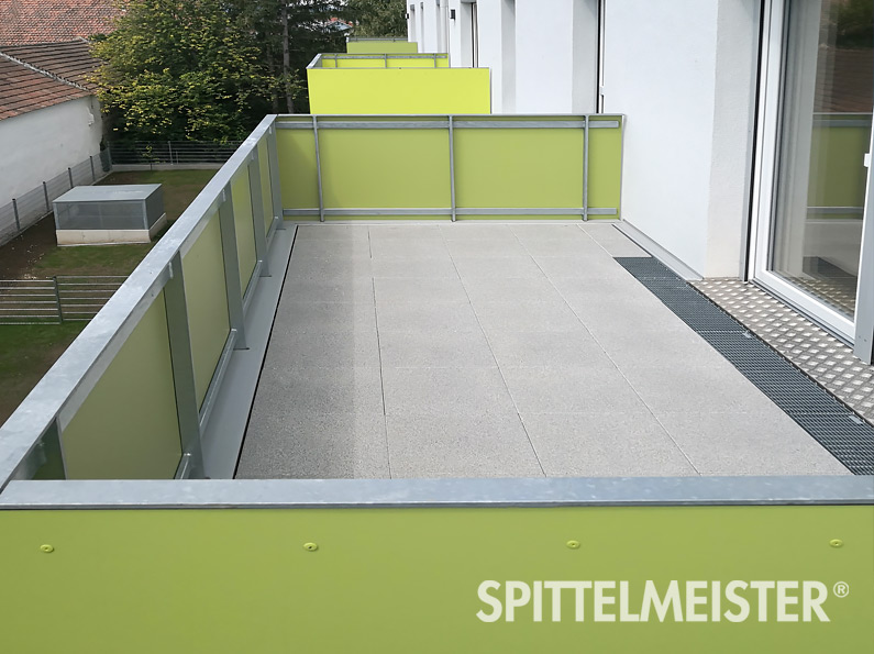 Beim Spittelmeister® Betonbalkon benötigen Sie keine extra Bodenplatten. Die Lauffläche unserer Betonplattform besteht aus schalglattem Beton und wird mit Gefälle zu einem Bodenablauf konzipiert. Zusätzliche Wünsche, wie zum Beispiel seitliche Aufkantungen und Farben können können je nach Anforderung leicht berücksichtigt werden.