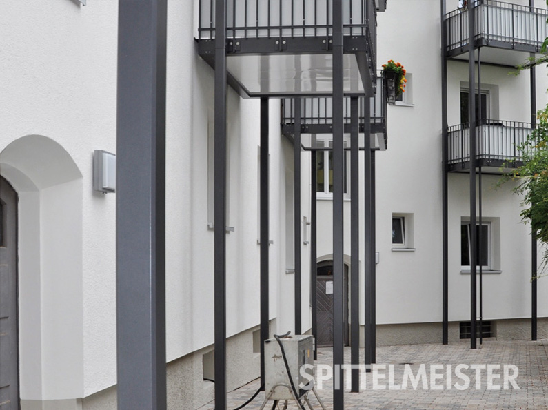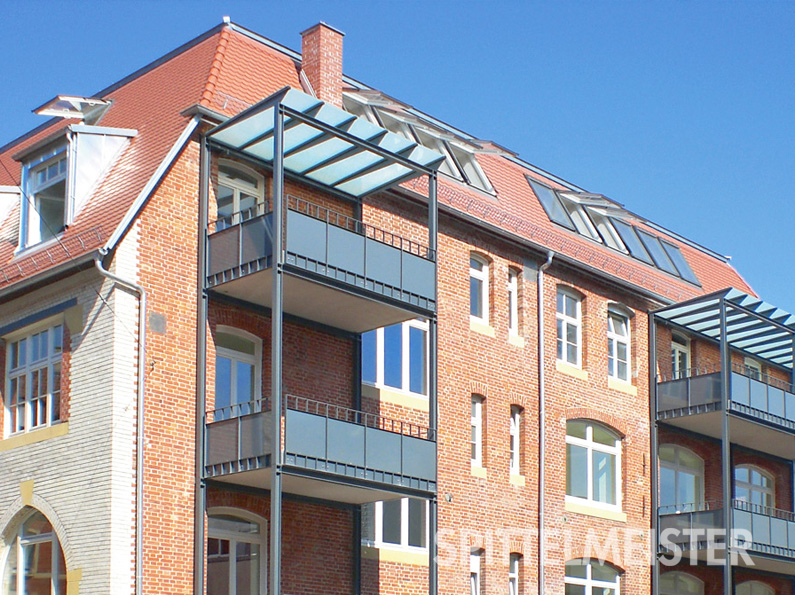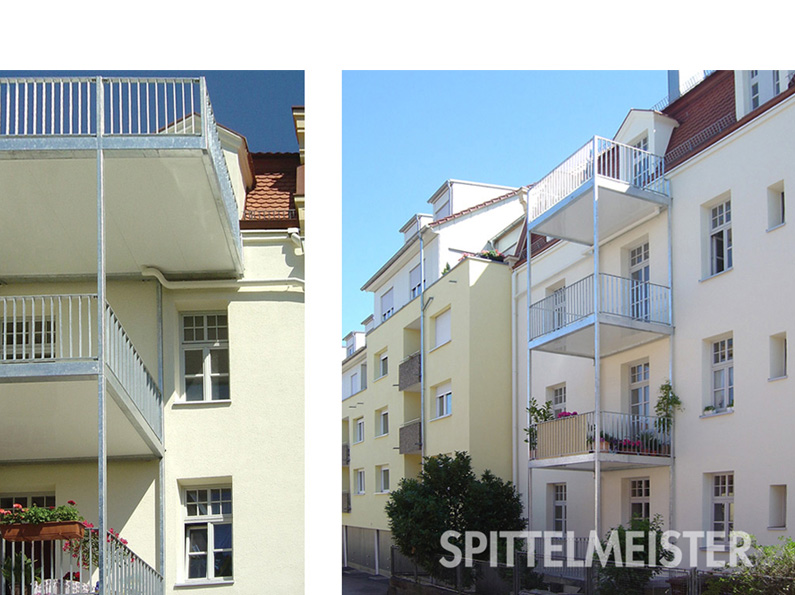 Unsere Stahlbalkone mit Stahlstützen sind perfekt geeignet, um komplizierte Balkonkonstruktionen zu ermöglichen. Soll es ein Alubalkon sein, dann kombinieren wir – um den Denkmalschutzvorschriften gerecht zu werden – Alu-Balkonrahmen und Alu-Stützen mit feuerverzinkten und pulverbeschichteten Flachstahlgeländern.