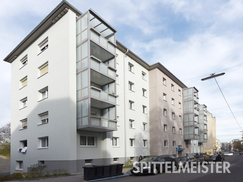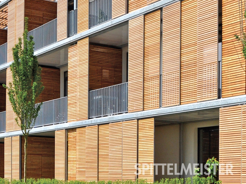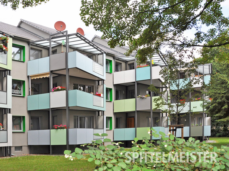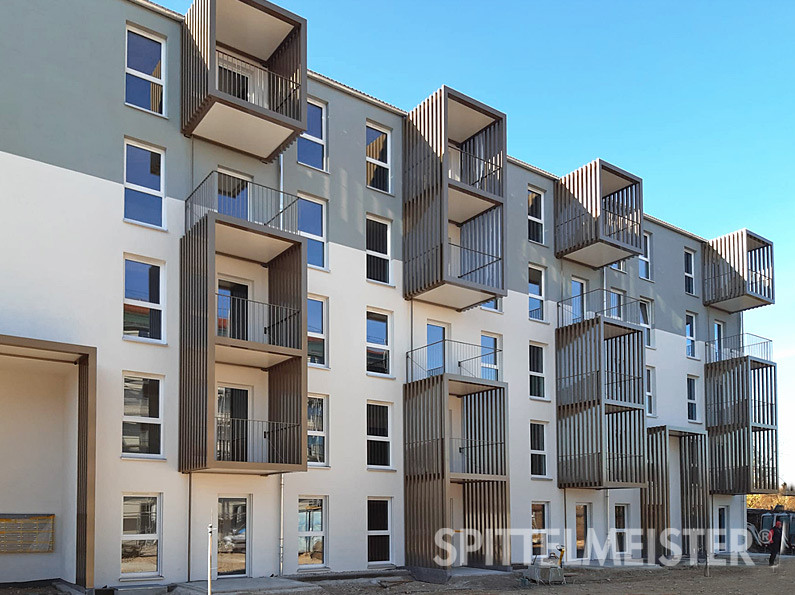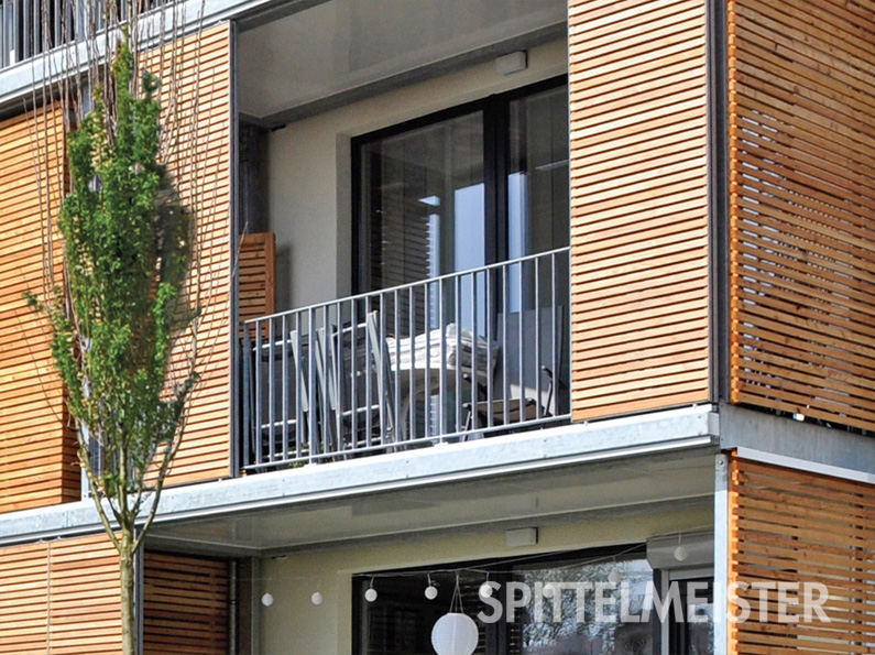 Die Balkone und Balkongeländer sind aus Aluminium, genau wie die optisch prägnante, seitliche Lamellen-Verkleidung. Mehr Informationen und Bilder zum Projekt «185 Balkone im Baukastenprinzip» Balkone München