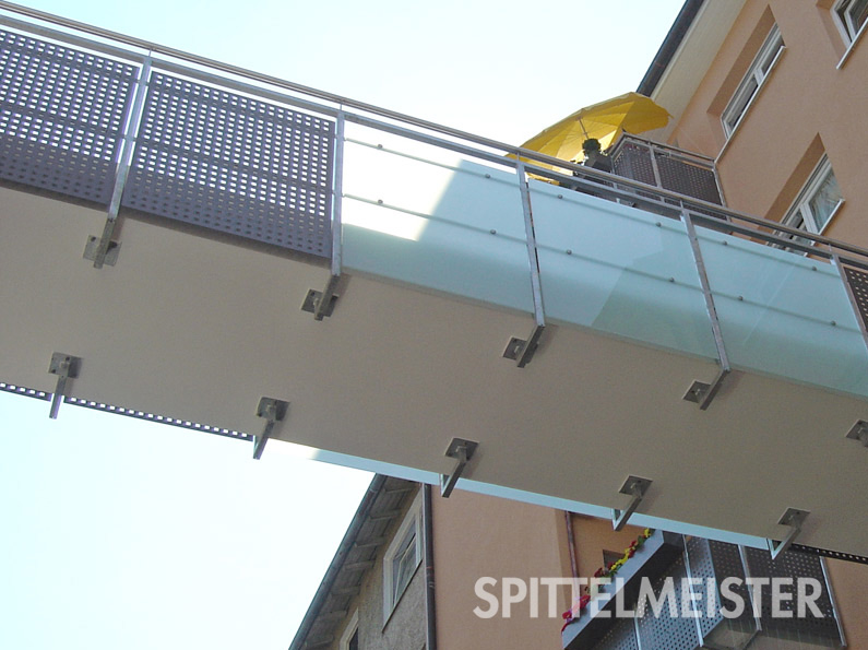 Die Geländerbrüstungen sind aus einem farbig-pulverbeschichtetem Stahlrahmen mit einer Verglasung (VSG) in mattweißer Folie, als Absturzsicherung.