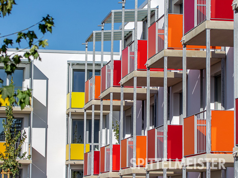 Interessante Gestaltungen ergeben sich aus der Verwendung unterschiedlicher Werkstoffe zur Gebäudestrukturierung, wie an diesem großen Mehrfamilienhaus. Moderne Balkongeländer aus grauem Glas werden kombiniert mit Handläufen aus Aluminium. Die weißen Balkonbrüstungen wurden mit pulverbeschichtetem Aluminiumblech und an einer anderen Gebäudeseite mit weißen HPL-Kunststoffplatten verkleidet.