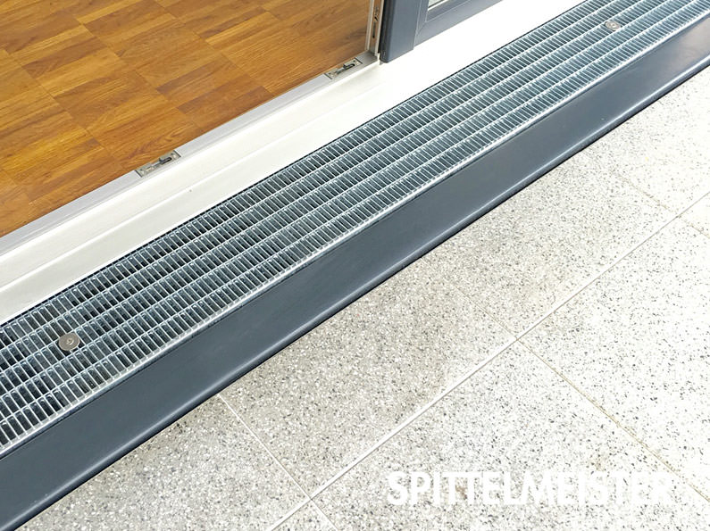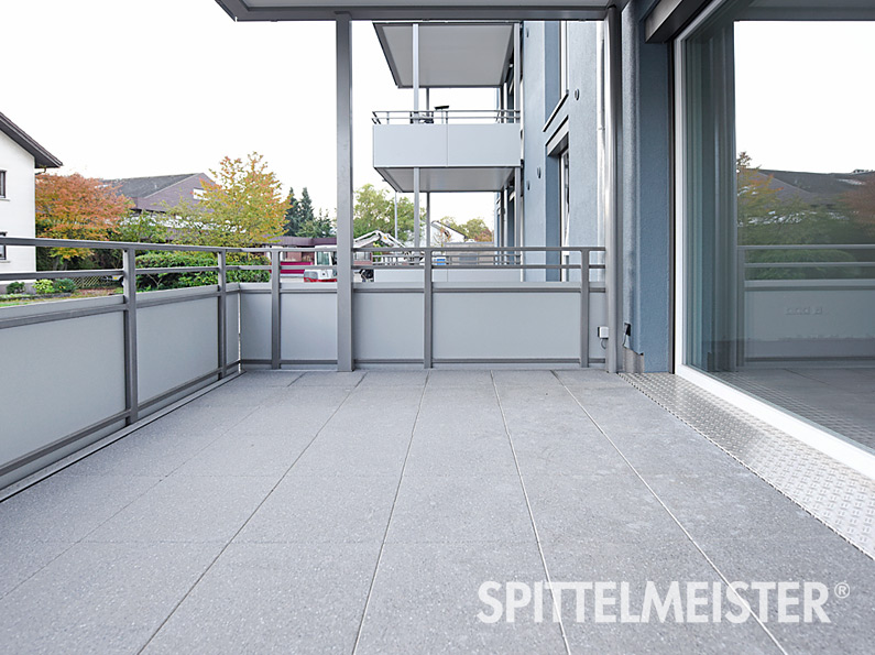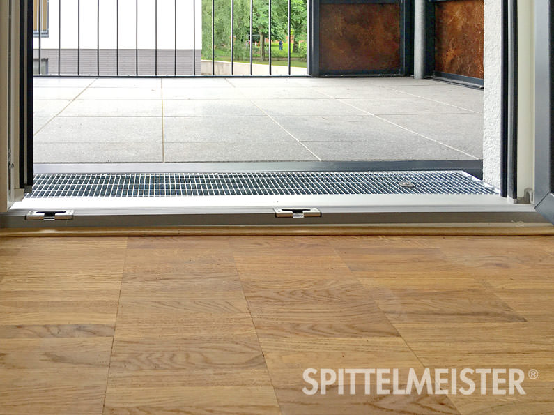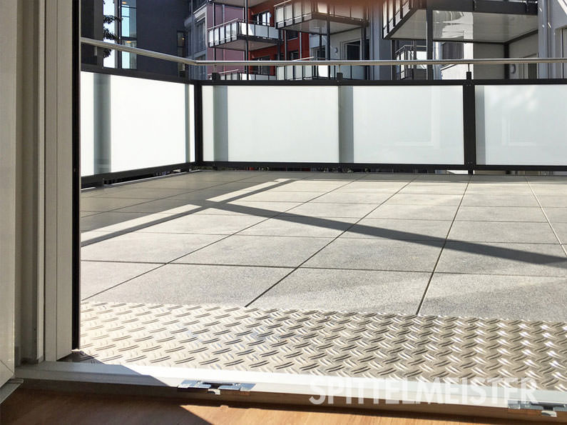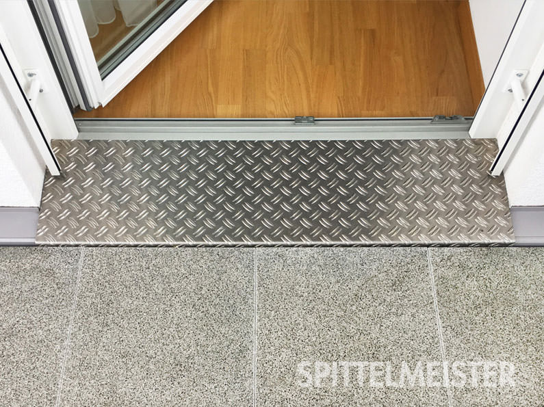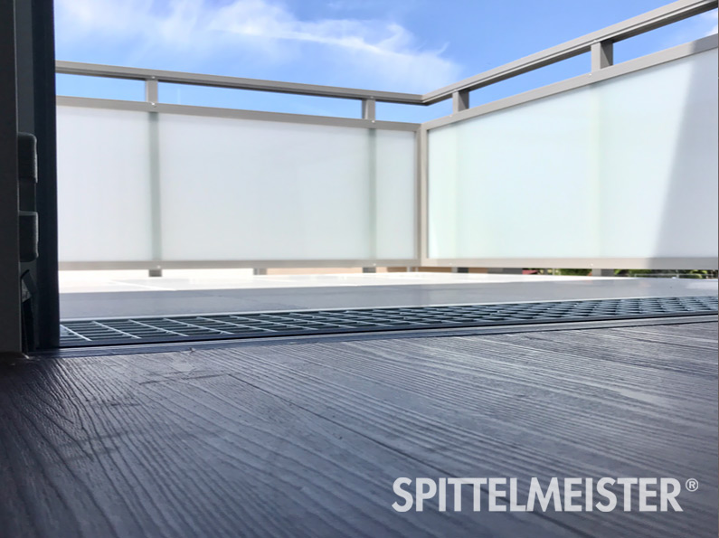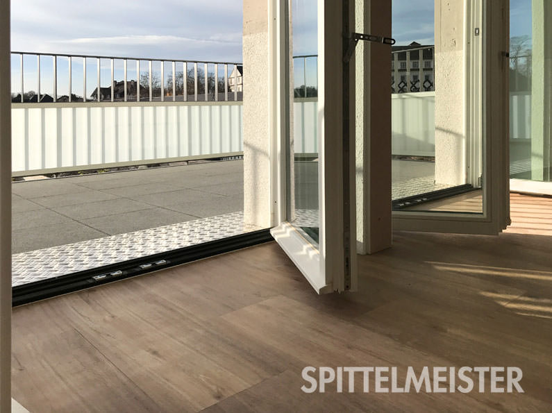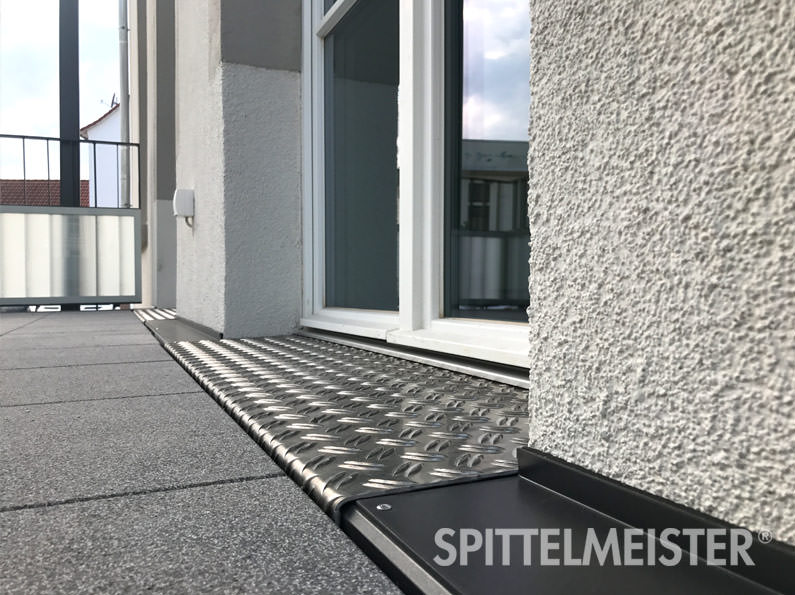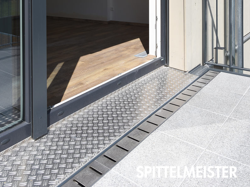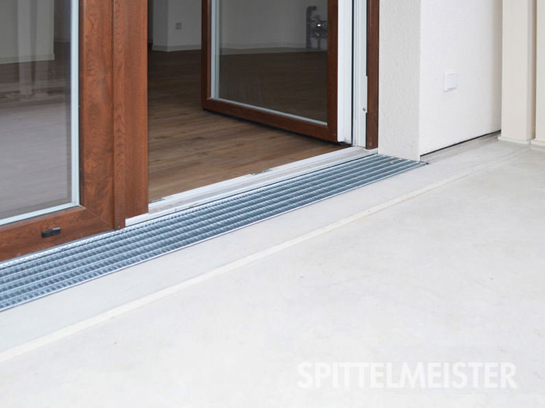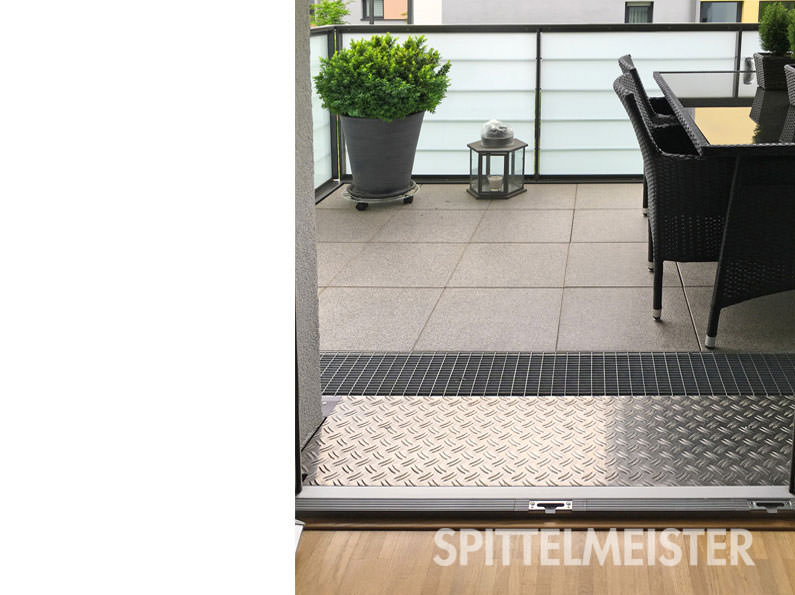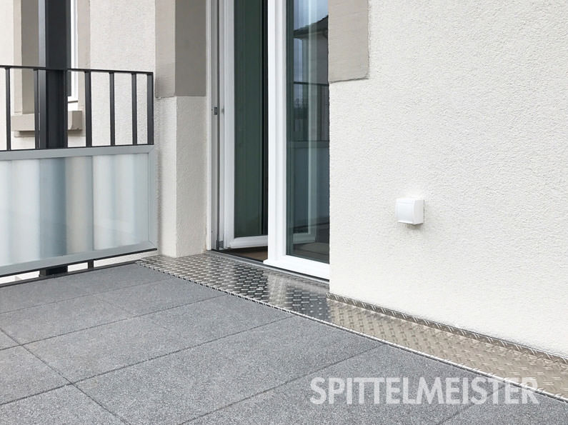 Wir realisieren den barrierefreien Übergang häufig mit einer Kombination von Gitterrost als Abschluss des Balkonbelages und einem Riffelblech als Übergang zur Balkontür. Auf diese Weise kann sicher gestellt werden, dass auch bei einer Ansammlung von Schnee, keine Feuchtigkeit über die Schwelle der Balkontür in die Wohnung eindringt.