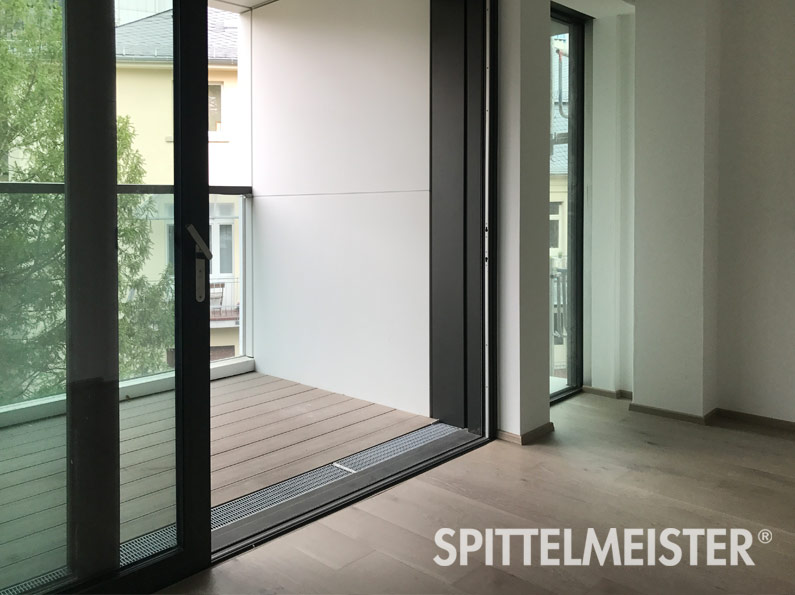 Damit anfallendes Regenwasser vom Balkon ohne Probleme abfließt bzw. dass es zu keinem Eindringen von Wasser im Balkontürbereich in die Wohnung kommt, wurden von uns spezielle Balkonübergangs-Konstruktionen entwickelt, die auch den Anforderungen der Flachdachrichtlinie (vgl. Flachdachrichtlinien des Zentralverbandes des Deutschen Dachdeckerhandwerks – Fachverband Dach-, Wand- und Abdichtungstechnik e. V. [ZVDH], 2001) Rechnung tragen. Diese werden von uns, objektbezogen, immer mit dem Architekten und dem Bauherren abgestimmt.